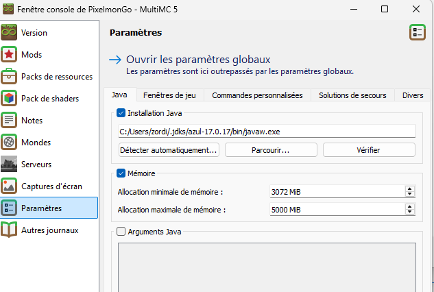 Une fois le modpack installé, accédez aux paramètres de MultiMC et sélectionnez le profil PixelmonGo. Vérifiez que Java 17 est bien défini comme version active.